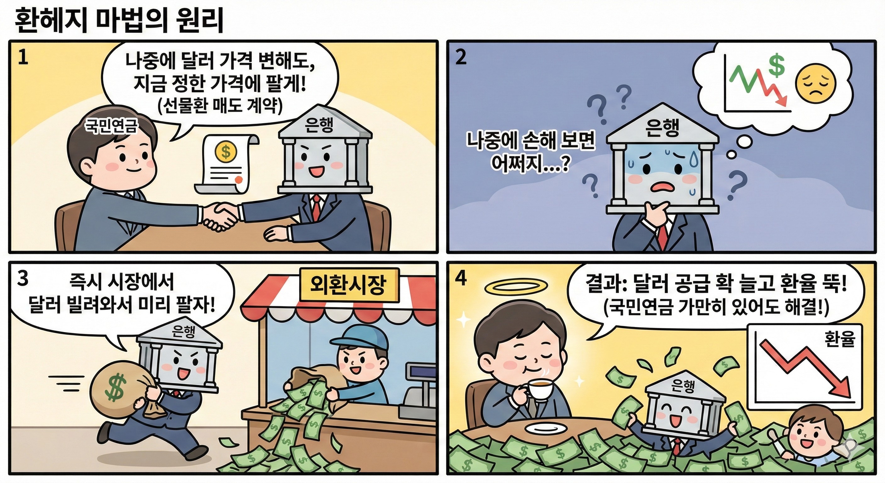 - 국민연금이 은행과 "나중에 달러 가격이 변해도, 지금 정한 가격에 팔게(선물환 매도)"라고 계약을 맺습니다.